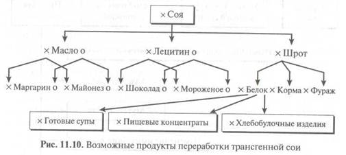 Возможны различные подходы к оценке генетически измененного сырья и готовых пищевых продуктов из него. Это можно проиллюстрировать на примере трансгенной сои и продуктов ее переработки (рис. 11.10).