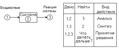 На рис.3.4. и в таблице к рисунку дается толкование действий синтеза, анализа и принятия решения на примере рассмотрения некоторой системы при входном воздействии на нее и наличии реакции системы.