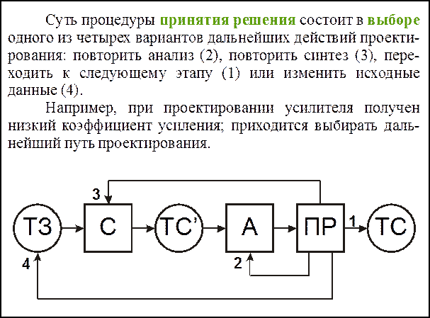 Таким образом, говоря о сущности действия проектирования можно представить его как многократно повторяющиеся действие синтеза, анализа и принятия решений, причем возможны повторные действия, как внутри цепочки "синтез-анализ-принятие решения", так и повторение цепочки в целом.