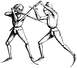 | Лист 39 Das Binden ober Engagieren der klingen mit Gewalt (Dression). - Ober das Anbinden (Engagieren) mit kurzem Schwert. Соединиться, сильно сцепив клинки. - В соединение (зацепление) с укороченным мечом. Здесь, кажется, показана стычка в ближнем бою на полумечах. Боец слева держит свою кисть впереди, чтобы ее быстро двинуть для захвата. У него внутренняя линия. Боец справа, также в "укороченной" позиции полумеча, встречает движение с силой, чтобы сместить острие противника с его цели. Продолжение на листе 40. |