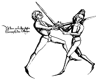 | Лист 40 Aus dem Anbinden im kurzen Schwert. Завершение соединения в полумечах. Продолжая лист 39, где бойцы заняли противоположные позиции на иллюстрации, мы видим, что боец справа (левый на листе 39) толкнул клинок противника вниз своей рукой на клинке, разрывая влево и вниз, чтобы ударить навершием справа. Его противник, пытающийся сделать встречный удар своим навершием, остановлен входящим ударом. |