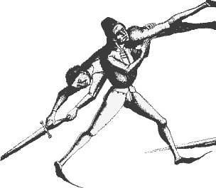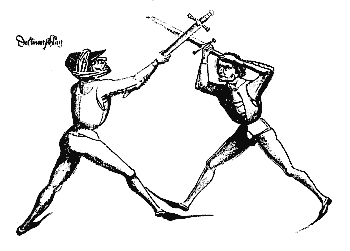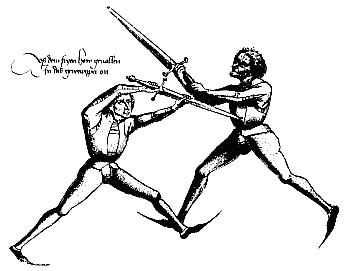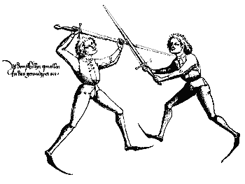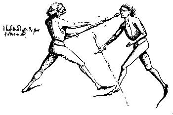 | Лист 35 “Aus dem freien hieb vorfallen (ausfallen) in das gewappnete Ort.” Из свободной стойки упасть вперед в позицию полумеча. Комментарий AEMMA: "Aus dem freien hieb vorfallen", судя по другому упоминанию "freien" и "vorfallen", является инструкцией упасть впередиз нескрещенной подвешенной стойки в уколо полумечом. Иллюстрация, кажется, намекает на то же самое. |