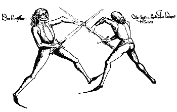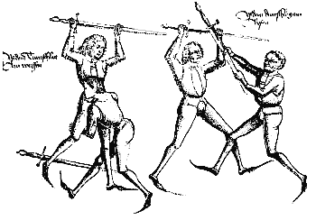 | Лист 31 Aus dem Anbinden vorfallen (ausfallen) zum unteren Stoss. Из соединения упасть вперед (упасть наружу) в нисходящем уколе. Кажется, у нас здесь боец шагает вперед (vorfallen) из соединения, нанося укол вниз (unteren stoss) свободным ударом. Это, должно быть, соответствует другим инструкциям двигаться прочь из соединения мечей, поднимая руки и вонзая над клинком и вниз. Фехтовальщик слева находится в стойке Ключа, его противник справа вращается над ней в scheitelhau |