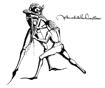 | Лист 36 Aus dem Schielhieb vorfallen in das gewappnete Ort. Из позиции скользящего удара упасть вперед в уколе полумечом. Скользящий удар является мастерским ударом, где вы бьете сквозь входящую атаку, жестко скользя по его клинку со встречным уколом. Этот пример показывает форму скользящего удара, где левая рука двигается вперед во время парирования, чтобы обеспечить удар полумечом (см. Голиаф, стр. 152) |