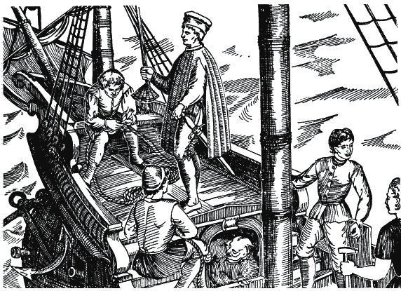 Даже сегодня, несмотря на радиосвязь, находящийся в море корабль – это особый отдельный мир. А в дни великих морских путешествий его изолированность и ощущение общности усиливались малыми размерами судна и ограниченной величиной команды. Ранние корабли редко бывали больше 100 футов[4] в длину, а численность команды колебалась от сорока до пятидесяти человек. Капитан тогда вовсе не был той богоподобной фигурой, наделенной абсолютной властью и авторитетом, какой стал позднее. Члены команды собирались вместе ради наживы, и капитан точно так же не знал, какие встретятся на пути опасности, как любой из них. Дисциплина на таком корабле, месяцами или даже годами бороздившем неизвестные воды в неизученных краях вдали от родных берегов, поддерживалась лишь общим согласием. Когда шторм настиг судно Колумба всего за несколько дней до окончания его первого триумфального плавания и грозил его потопить, адмирал приказал тянуть жребий. Вытянувший его обязан был при благополучном завершении плавания совершить паломничество к святым местам. Колумб и сам принял участие в жеребьевке, и помеченный боб достался ему. Он принес обет и доверился милости Божьей, но, действуя как осторожный мореход, поместил отчет о путешествии в деревянную бочку и бросил ее в море, чтобы она сохранила данные экспедиции, если они погибнут.