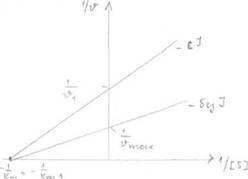 Уменьшение Vmax происходит потому, что при помощи ингибитора из ферментативной реакции выводятся молекулы фермента, меньше молекул фермента, меньше Vmax. График Лайнуивера-Берка выглядит следующим образом: