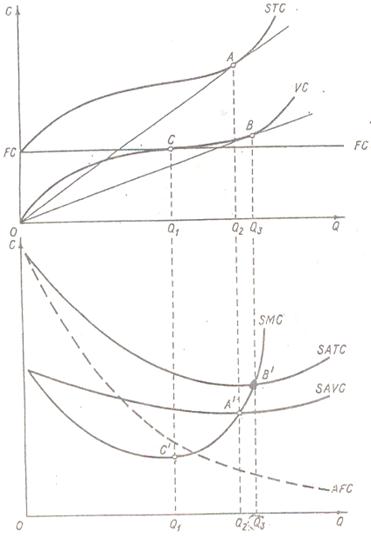 Величина средних затрат определяются тангенсом угла наклона луча, проведенного из начала координат, до точки на кривой STC или ТVC. Очевидно, что эти углы будут минимальны при объемах производства Q2 и Q3 соответственно.