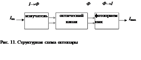 Комбинацией опто и фотоэлектронных приборов является оптопара (оптрон). Структура оптопары приведена на рис. 11. В ней входной электрический сигнал Iвх преобразуется в оптический сигнал Ф, в качестве преобразователя обычно используют светодиод или полупроводниковый лазер (излучатель). Оптический сигнал Ф распространяется через оптический канал. Канал может быть открытым (вакуум, газ или жидкость) и закрытым (оптический световод). На выходе оптического канала имеется фотоэлектронный преобразователь – фотоприемник (фоторезистор, фотодиод, фототранзистор или фототиристор) в котором оптический сигнал Ф преобразуется в электрический Iвых. Двойное преобразование входного сигнала I→Ф и Ф→I позволяет получить практически идеальную гальваническую развязку входного и выходного сигналов, невосприимчивость оптических каналов к электромагнитным помехам, однонаправленность потока информации, отсутствие обратной связи с выхода на вход и широкую полосу пропускания. К недостаткам оптопар следует отнести нелинейность их проходных характеристик, низкий КПД, температурную зависимость параметров, и высокий уровень собственных шумов.