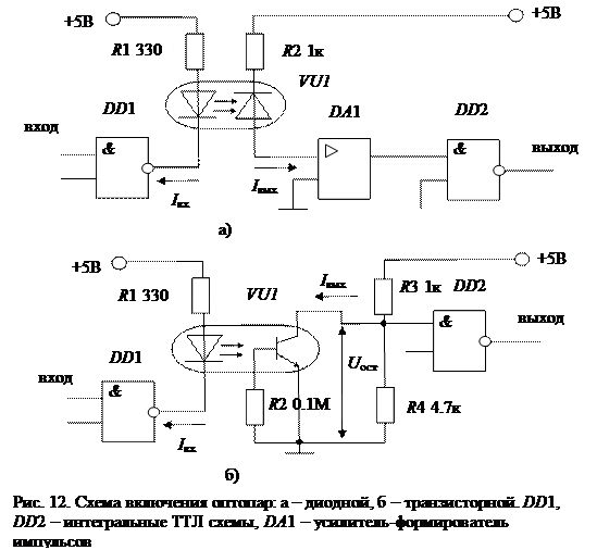 Фототранзистор обладает внутренним усилением фототока. Коэффициент передачи по току транзисторных оптопар KI = Iвых/ Iвх имеет величину порядка единицы. Передаточная характеристика транзисторной оптопары Iвых = f(Iвх) нелинейна. Транзисторные оптопары применяют обычно в ключевом режиме для передачи импульсных сигналов рис. 12,б.