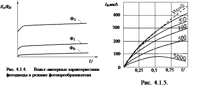 Режим фотопреобразователя соответствует подаче напряжения на фотодиод в запирающем направлении (участок аб на рис. 4.1.2). Вольтамперные характеристики фотодиода в этом режиме при различных значениях светового потока показаны на рис. 4.1.4.