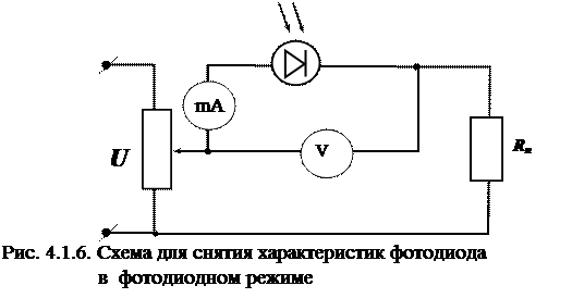 На рис 4.1.6 приведена схема для снятия вольтамперных, световых и температурных характеристик фотодиода в фотодиодном режиме. Способ изменения и контроля светового потока, его спектрального состава, а также модуляции светового потока изложен в методических указаниях.