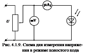 Схема на рис. 4.1.7 предназначена для снятия вольтамперных и световых характеристик фотодиода в вентильном режиме (RH – магазин сопротивлений, используемый в качестве нагрузки). Ток в режиме короткого замыкания и напряжения в режиме холостого хода могут быть измерены с помощью компенсационных схем на рис. 4.1.8 и 4.1.9, в которых используется микроамперметр с малым внутренним сопротивлением (mА1).