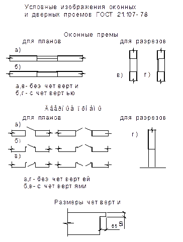 Условные обозначения оконных и дверных проемов с заполнением и без него изображают согласно ГОСТ 21.107- 78 *. При использовании масштаба 1:50 или 1:100, при наличии в проёмах четвертей их условное изображение дают на чертеже. Четверть – это выступ в верхних и боковых частях проёмов кирпичных стен, уменьшающий продуваемость и облегчающий крепление коробок. На рис.2.1.1 даны примеры обозначения оконных и дверных проёмов и указаны размеры четверти.