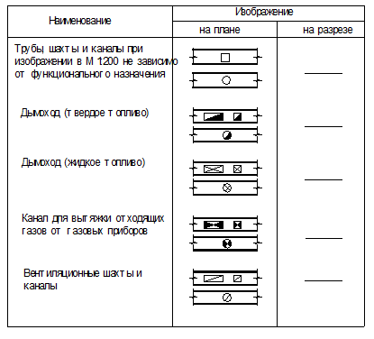 Каналы, устраиваемые в кирпичных стенах, обычно имеют сечение с учетом швов раствора 270´140 мм или 140´140 мм. Минимальное расстояние между соседними каналами, а также от канала до грани стены (на плане) равно 120 мм. На рис.2.1.2 даны примеры обозначения вентиляционных каналов.