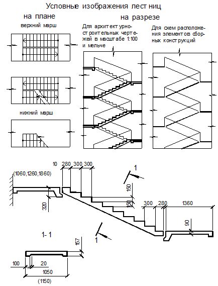 На рис. 2.1.3 показаны изображения лестниц на плане и разрезе.