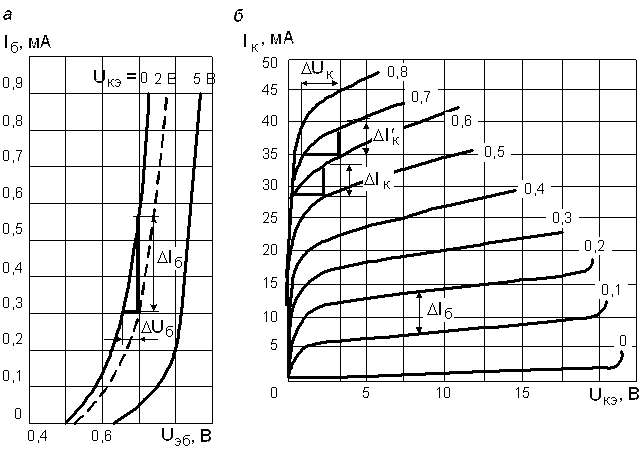 Рис. 13.1. Характеристики транзистора: а – входные; б – выходные (для КТ312А, КТ312Б DIб = 0,1 мА; для КТ312В DIб = 0,05 мА)