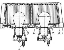 | Рис. 92. Двухсекционный габаритный фонарь коляски типа ПФ-232: 1 - корпус фонаря; 2 - рефлектор лампы; 3 - резиновая прокладка рассеивателя; 4 - рассеиватель фонаря; 5 - электрическая лампочка; 6 - клемма подсоединения к электрической сети мотоцикла |