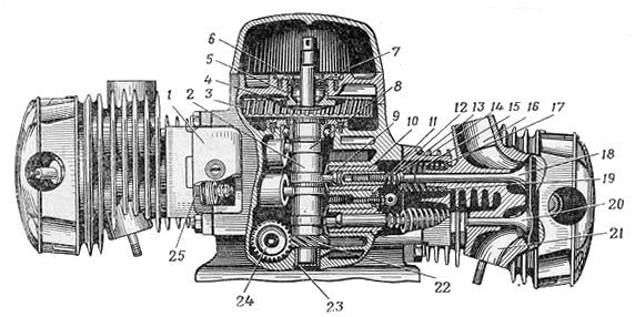 1 – крышка клапанной коробки; 2 – распределительный вал; 3 – шестерня распределительного вала; 4 – поводок сапуна; 5 – сапун; 6 – фланец распределительного вала; 7 – сальник распределительного вала; 8 – выпускной кулачок распределительного вала; 9 – толкатель; 10 – направляющая толкателя; 11 – контргайка; 12 – регулировочный болт толкателя; 13 – нижняя тарелка клапанной пружины; 14 – сухарь; 15 – пружина клапана; 16 – выпускной патрубок; 17 – верхняя тарелка клапанной пружины; 18 – выпускной клапан; 19 – теплоизоляционная прокладка; 20 – впускной клапан; 21 – впускной патрубок; 22 – спиральная шестерня распределительного вала; 23 – втулка заднего подшипника распределительного вала; 24 – шестерня привода масляного насоса; 25 – прокладка крышки клапанной коробки