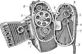 | Рис. 11. Камера (коробка) распределительных шестерен двигателя К-750: 1 - ведущая шестерня газораспределения; 2 - сапун; 3 - трубка сапуна; 4 - сальник; 5 - подшипник сапуна; 6 - шестерня привода генератора; 7 - крышка распределительной коробки; 8 - отверстие для поводка сапуна; 9 - отверстие для проводов высокого напряжения; 10 - ведомая шестерня газораспределения |