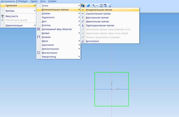 на панели Текущее состояние. Нажал кнопку инструменты => Геометрия => Вспомогательные прямые => Вспомогательная прямая. Начертил горизонтальную и вертикальную вспомогательную прямую.