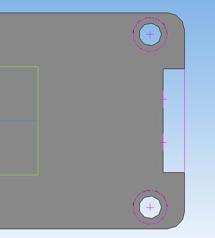 Выбрал эскиз передней поверхности и создал 2 окружности диаметром 8мм. Создал 2 отверстия глубиной 18мм. Так же, создал паз шириной 30мм с радиусами скругления 6мм.