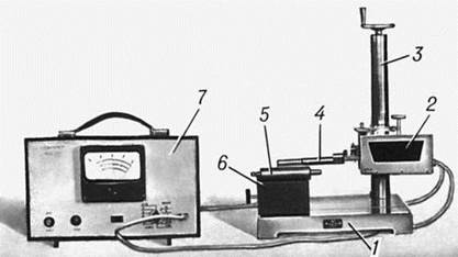 Рис. 8. Профілометр (модель 253 заводу «Калібр»): 1 - станина; 2 - привід; 3 - стійка; 4 - датчик; 5 - деталь; 6 - вимірювальний столик; 7 - електронний блок з показуючим пристроєм.