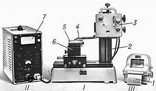 Рис. 10. Профілограф-профіломер (модель 202 заводу «Калібр») для визначення висот неравномерностей від 0,03 до 80 мкм на трасі обмацування до 36 мкм: 1 - профілограмма; 2 - стійка; 3 - привід; 4 - датчик; 5 - деталь; 6 - вимірювальний столик; 7 - показує пристрій електронного блоку.
