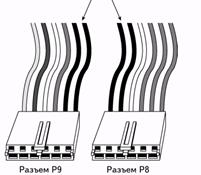 При підключенні роз'ємів Р8 і Р9 до системної плати необхідно дотримуватися правила: суміщати чорні дроти всередину один до одного (так, як показано на наступному малюнку). Деякі виробники корпусів і блоків живлення роблять спеціальні ключі, які не дозволяють неправильно підключати роз'єми живлення до системної плати. Такий роз'єм дозволяє підключити живлення до системної плати єдино правильним способом.
