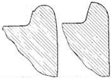 Кроме перечисленных выше неисправностей колёс, также нередко встречаются на поверхности катания кольцевые выработки (рисунок 7), смещение металла и остроконечный накат на участке сопряжения подрезанной части гребня с его вершиной (рисунок 8) .Кольцевая выработка допускается у основания гребня глубиной не более 1 мм и на уклоне 1:7 не более 2 мм или шириной б не более 15 мм. Смещение метала (навар) допускается высотой у колёсных