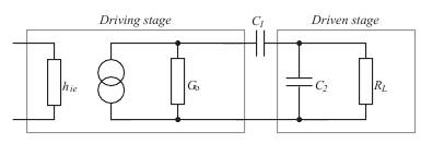 the collector resistor Rc. The driving stage is coupled by C1 to the driven stage.