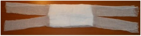 Оставшиеся по длине марли концы разрезают на 25-30 см с каждой стороны для завязывания.