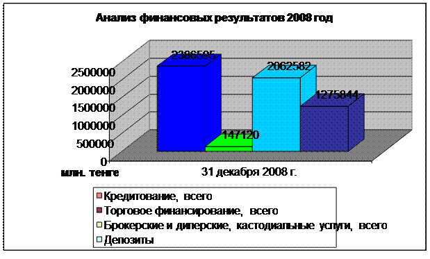 - брокерские, дилерские, кастодиальные услуги возросли на 1 682%, их объем составил 2 062 582 млн. тенге по сравнению с аналогичным результатом 2007 года – 115 758 млн. тенге;
