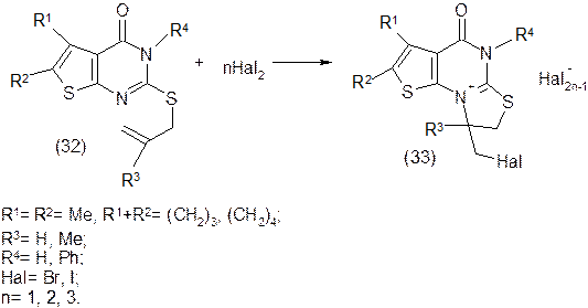 Для алкенільних похідних тієно[2,3-d]піримідину (32) відомі [15, 599-603] перетворення під дією галогенів у конденсовані полігалогенідні солі ряду 1,3-тіазоло[2,3-а]тієно[3,2-е]піримідину (33).