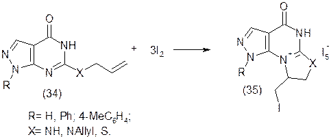 Циклізація 6-тіо(аміно)алільних похідних піразоло[3,4-d]піримідину (34) під дією йоду [16, 4353-4359] призводить до замикання 5-ти членного тіазолінового(імідазолінового) циклу на атом N7 піримідинового кільця.