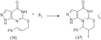 При дії трикратного надлишку йоду [17, 5-9] на 6-цинамілтіопіразоло[3,4-d]піримідин-4-он (36) відбувається замикання тіазинового кільця на атом N7 піримідинового кільця з утворенням структури (37) солеподібної будови.