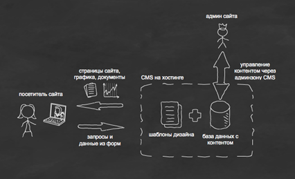 Ваша информация находится в отведенном вам дисковом пространстве (каталоге сервера). Обновлять информацию в этом каталоге (загружать, перемещать, удалять устаревшие файлы) Вы можете удаленно, например, с офисного компьютера с помощью CMS, подключаясь к Интернету. Сразу после загрузки информация становится доступной всем пользователям всемирной сети.