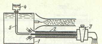 К баку 1 с водой присоединена прозрачная трубка 2 с вентилем 3 на конце, регулирующим скорость движения воды в трубке 2. Из сосуда 4 по трубке 5 в устье трубки 2 поступает подкрашенная жидкость.