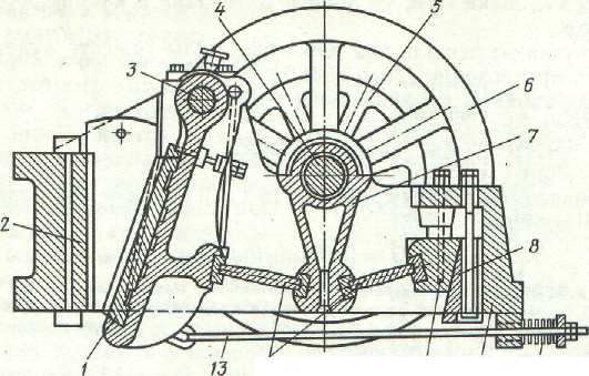 1— подвижная щека; 2 — неподвижная щека; 3 — ось подвижной щеки; 4 — эксцентриковый вал; 5—шкив; 6 — маховик; 7—шатун; 8, 11 — регулировочные клинья; 9 — пружина; 10 — станина; 12 — рычаги; 13— тяга