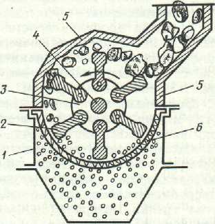 1 - корпус; 2 — дробящий молоток; 3- диск; 4 — вал; 5 — броневая плита; 6 -колосниковая решетка
