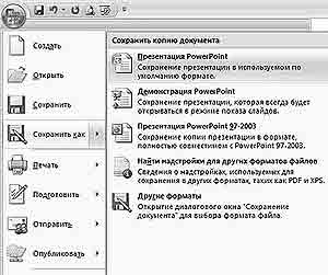 Когда все будет готово, сохраните презентацию на компьютере. Для этого нажмите кнопку Office, которая находится в левом верхнем углу окна программы, и выберите в меню команду Сохранить как. Из раскрывающегося списка выберите формат сохранения презентации (рис. 8). Вот и все: за короткий промежуток времени вы создали довольно профессиональную презентацию.