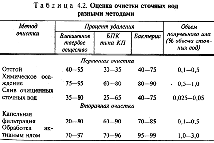 Не все органические вещества разлагаются на станциях биохимической очистки. Так, практически не разрушается бензин, красители, мазут и др. Эффективность биохимической очистки на самых современных установках составляет 90% по органическим веществам и лишь 20–40% – по неорганическим, т. е. практически не снижается солесодержание. Не могут быть очищены воды, содержащие более 1000 мг/л фенолов, 300–500 мг/л спиртов, 25 мг/л нефтепродуктов, т. е. для многих случаев эти методы не эффективны. В среднем эффективность анаэробного метода составляет около 40%. Сравнительная оценка очистки сточных вод различными методами представлена в табл. 4.2.