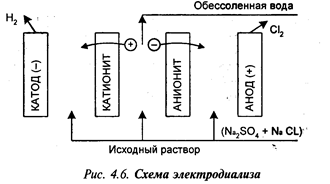 в) Мембранный метод. Это электродиализ и гиперфильтрация, или обратный осмос. Электродиализ – современный метод деминерализации и концентрирования растворов. Основан на направленном переносе ионов диссоциированных солей в поле постоянного тока через ионселективную мембрану из естественного или синтетического материала. Схема электродиализа представлена на рис. 4.6. За рубежом этот метод получил широкое распространение для обессоливания морской воды. Например, установка в Ливии на 20 тыс. м3/с., в США – на 400 тыс. м3.