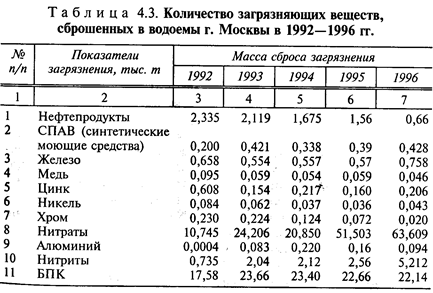 В 1996 г. в г. Москве была проверена водоохранная деятельность на территории города. Установлено, что к основным нарушениям относятся неудовлетворительная эксплуатация и состояние водоочистного оборудования, отсутствие разрешений на спецводопользование, сброс сточных вод с превышением нормативных показателей. Участились случаи аварийных и залповых выбросов загрязняющих сточных вод на рельеф местности и в водоемы. В 1996 г. в водоемы города было сброшено 1305 тыс. т загрязняющих веществ (нефтепродуктов, тяжелых металлов, нитратов, хлоридов, взвешенных веществ и др.), но это почти в 2 раза меньше, чем в 1995 г. Количество загрязняющих веществ, сброшенных в 1996 г., составляет 22 наименования (табл. 4.3). Количество воды, используемой в оборотно-повторном водоснабжении, растет недостаточно: лишь на 16 предприятиях строятся очистные сооружения, а также системы оборотного водоснабжения.