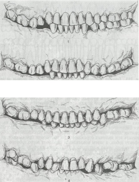 Смещение зубов. Изменения в расположении зубов (рис. 292) и форме зубных дуг, сроки проявления которых зависят от общей реактивности организма, при частичных дефектах обусловливаются главным образом внешними влияниями: при обработке пищи во рту создается разность напряжения в пародонтальных тканях у зубов, имеющих и не имеющих антагонистов или соседних зубов. Наклон зубов обусловлен давлением на зуб, падающим не по вертикальной его оси. Вертикальное перемещение антагонистов возникает в связи с образованием места наименьшего сопротивления для сил тканевого и межтканевого напряжения в пародонтальных тканях. Механизм вертикального перемещения зубов можно объяснить импульсами, возникающими при сжатии челюстей и поступающими к альвеолярному отростку (базальной дуге) через зубы, стоящие рядом с зубом, лишенным антагониста. Возникающее во время сжатия челюстей давление, передающееся через зуб опорным тканям, вызывает сдавливание системы костных балок и соответственное перемещение межтканевой жидкости в участок альвеолярного отростка, не воспринимающего непосредственное давление. Это внутритканевое напряжение, регулируемое центральной нервной системой через нервные приборы пародонта, и является фактором, заставляющим зуб смещаться вертикально по направлению к месту наименьшего сопротивления, что в литературе получило наименование феномена Попова—Годона. Жевательное давление и образуемое в связи с этим межтканевое и тканевое напряжение являются сильными раздражителями. В результате одновременно с вертикальным перемещением зуба происходят рост и перестройка пародонта.