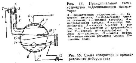 Горизонтальные сепараторы некоторых конструкций для повышения пропускной способности и улучшения качества сепарации нефти оборудуются гидроциклонами. Отделение газа от нефти в гидроциклонах происходит за счет центробежных сил. Нефть, имеющая большую плотность, отбрасывается к стенкам гидроциклона, а газовый вихрь, вращаясь, движется в центре. Из гидроциклона нефть и газ отдельно поступают в емкости (рис. 14).