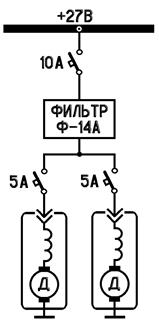 Защита сети обоих электромеханизмов осуществляется одним АЗС-10, а для индивидуального включения в работу каждого из них используются два АЗС-5 на левом пульте (рис. 31, 28). Эти АЗСы являются одновременно и выключателями стеклоочистителей. Схема питания стеклоочистителей приведена на рис. 32.