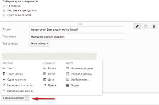 После этого открывается сама форма для создания вопросов, которая может состоять из разных элементов. Перечислю основные: