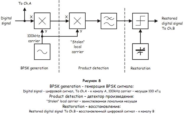 BPSK генератор, демодулятор и устройство очистки цифрового сигнала от искажений можно представить блок-схемой, изображенной на рисунке 8.