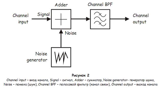 Собранную схему можно представить блок-схемой, приведенной на рисунке 2. Здесь моделируется работа настоящего канала связи, где помеха накладывается, например, на ASK сигнал.