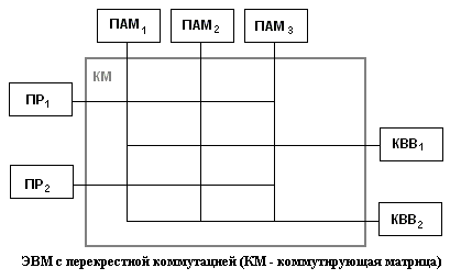 Все связи между узлами осуществляются с помощью специального устройства — коммутирующей матрицы, которая может связывать между собой любую пару узлов, причем таких пар может быть сколько угодно — связи не зависят друг от друга. В такой схеме нет конфликтов из-за связей, есть конфликты только из-за ресурсов. Возможность одновременной связи нескольких пар устройств позволяет достичь очень высокой производительности комплекса.